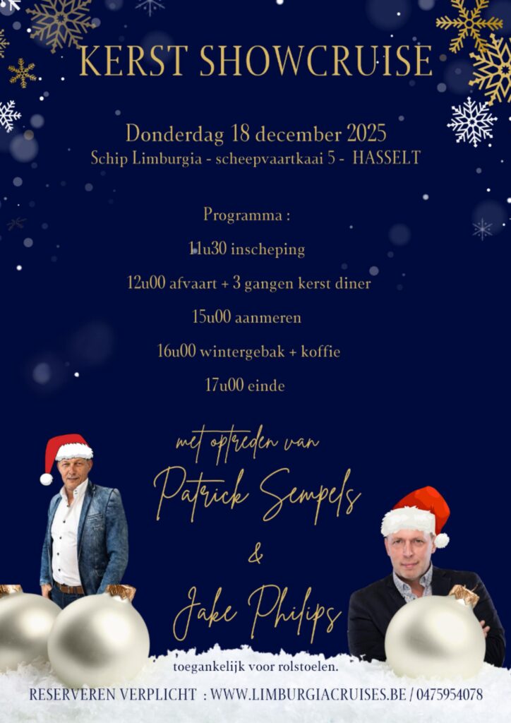 We hadden ons er op verheugd om dit jaar af te sluiten met een cruise van Antwerpen naar Drimmelen. Helaas moesten we deze afzeggen door het grote aantal annuleringen. Voor velen was dit dan ook een grote teleurstelling. Onverwachts krijgen we toch de kans om er dit jaar nog eens met zijn allen op uit trekken met de Limburgia en te genieten van een kerst show cruise voor de prijs van €45/pp.